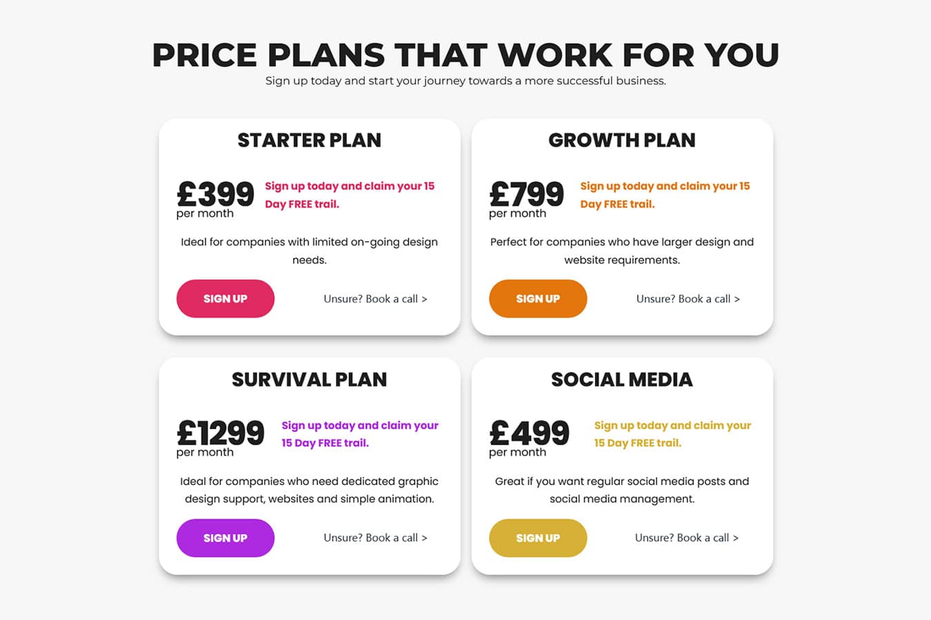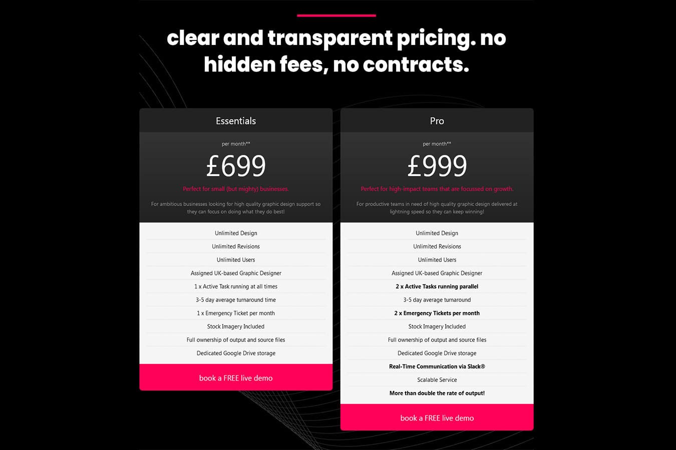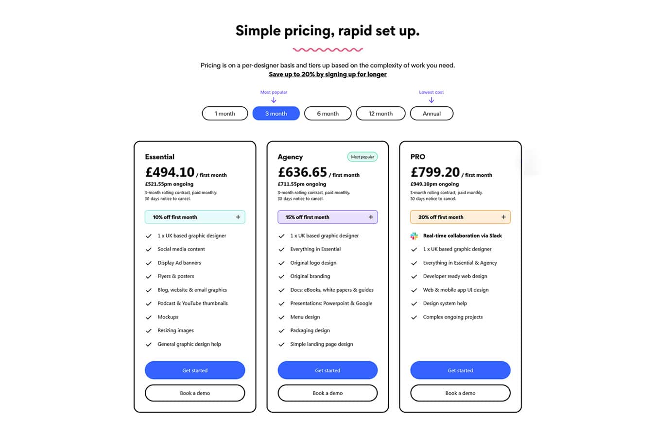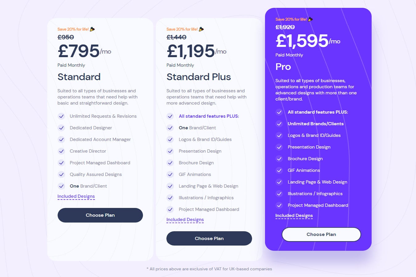 On the per-month option, the plans sit at £549, £749, and £999. These prices are fair and can save companies quite a bit when hiring an in-house designer.