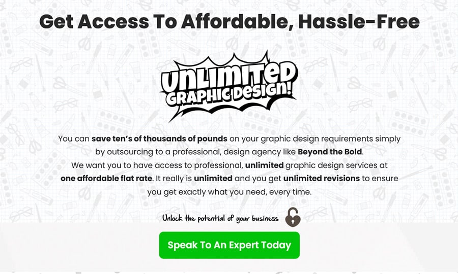 Beyond the Bold is a UK-based unlimited graphic design service that offers unlimited designs and revisions as a part of its monthly subscription service. It’s no contract, and you can cancel at any time. They specialize in nearly all types of graphic design and can provide almost any design asset you need, including social media content, website content, and paid ads. They don’t do PowerPoint Presentations, Catalogues, End of Year Reports, and very complex photography editing or video.