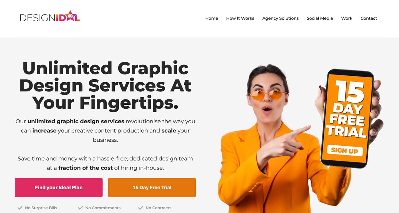 Design Idol is an unlimited graphic design service focusing on graphics, web design and development, and motion graphics animation. They offer three tiered plans for businesses of any size and agencies. They’re based in the United Kingdom and can provide ongoing work when you need graphic design but don’t want to pay thousands of dollars per year to hire an in-house graphic designer.