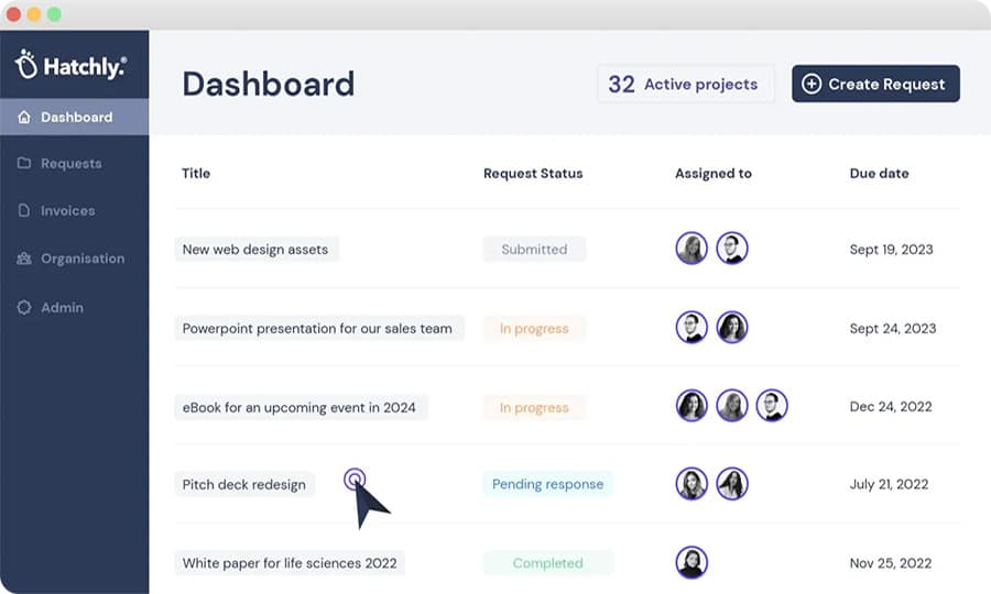 The Hatchly on-demand team works on your creative projects, no matter how big or small you or your projects are so that you can focus on running your business.