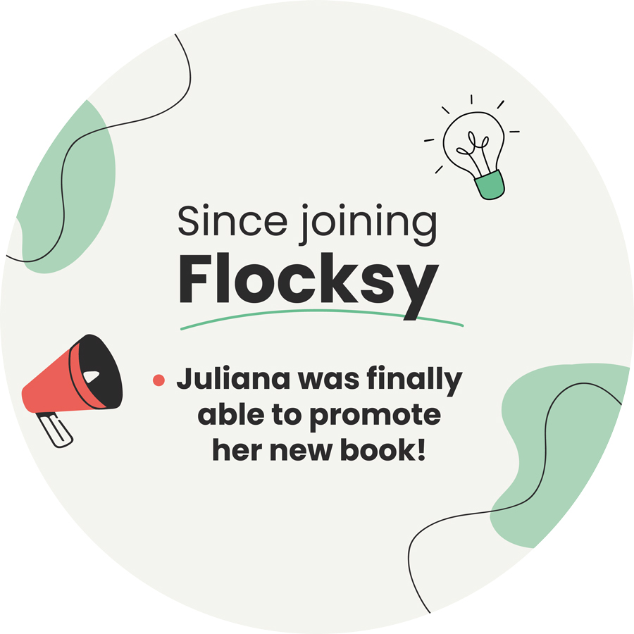 “The feedback I’ve gotten through my book has been really awesome…. To find ways to express that and show that back on social, for me, has been challenging. So to have people like Eliana go through and take all these reviews and put them over photos and make it look nice — that helps me take something that I’m very proud of, but struggled to promote, and it allows me to be able to do that. It’s all thanks to the help that Flocksy gave on that project.”