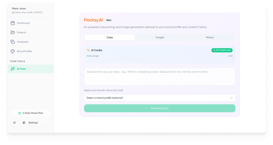 Our briefs make it simple to explain what you need without industry jargon. Add as much or as little detail as you’d like, and our AI can help expand on it, suggesting sizing, formatting, or organizing your ideas into a ready-to-go brief that sets your project up for success.