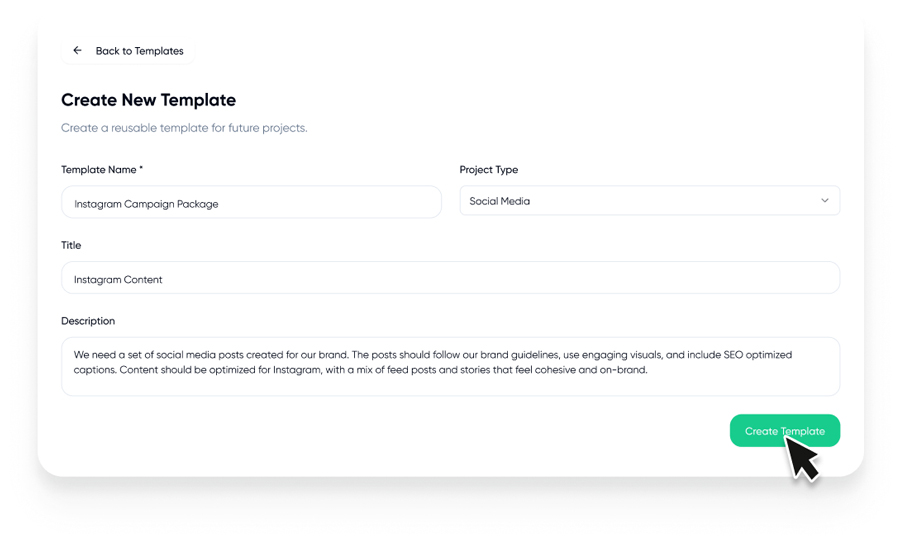 Create reusable templates for recurring or similar projects so you don’t have to start from scratch every time. Customize deliverables, sizes, formats, and brand details once, then simply edit as needed for each new project.