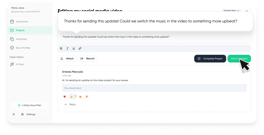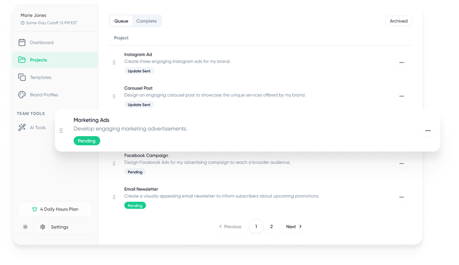 Load up your queue with as many projects as you want, and your team will work on your highest priority projects each day based on your plan’s daily hours. This keeps your creative pipeline moving fast and your brand’s momentum strong.