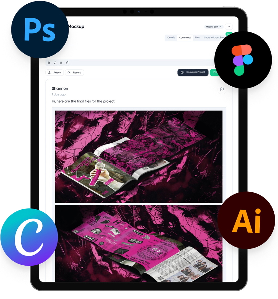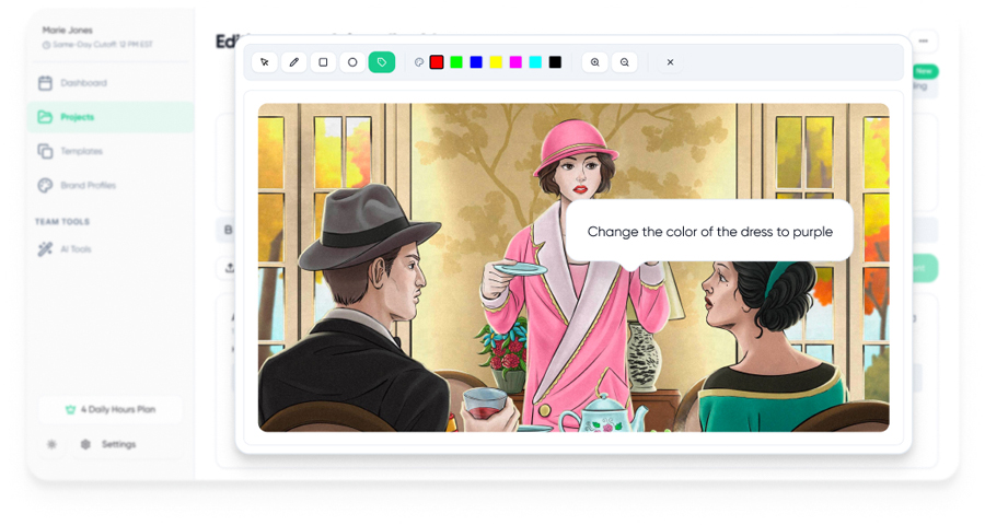 Our team of professional digital artists, custom illustrators, video editors, graphic designers and more are ready to deliver high-quality content in record time. With Dedicated Project Managers,  AI Assist and integrations with all your favorite apps — you can streamline your workflow and get your time back.