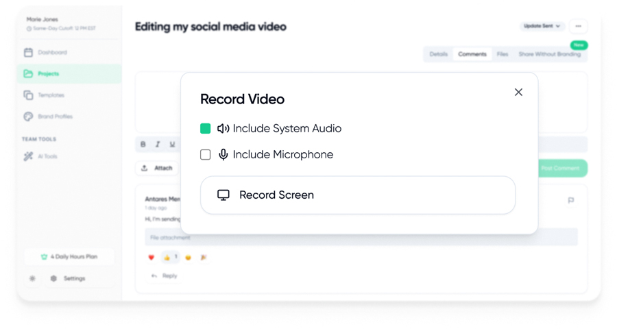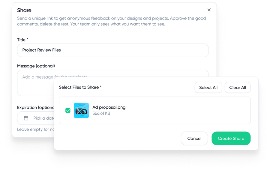 Generate a unique, unbranded link to share white-labeled projects and easily get feedback. With just one click, anyone can view the work, making it simple to present designs, copy, or videos without extra logins or distractions.