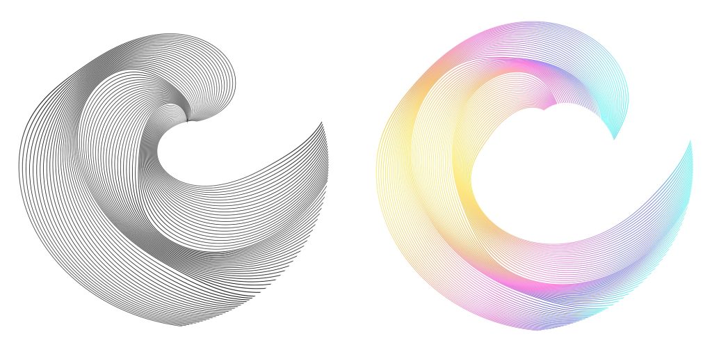Curved lines in this art form swoop, change direction, and bend. You’ll see both tight spirals and looser curves, and you’ll see waves. Curved line art often helps the viewer to feel a sense of ease and fluidity. They can be used to create romantic line art that reminds viewers of the human body- up close and far away- and natural shapes. Tight spirals often create a sense of energy and bounce like springs and curls.