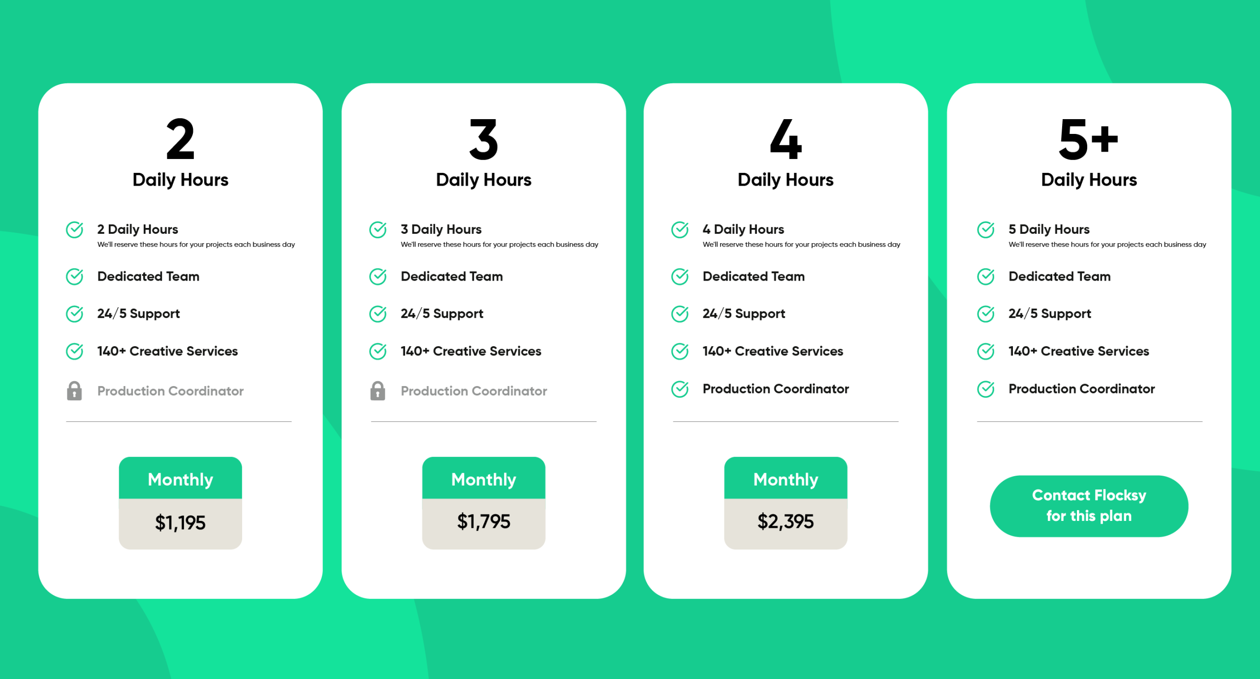 - Pricing begins at approximately $1,918 per month for two creative hours per business day.