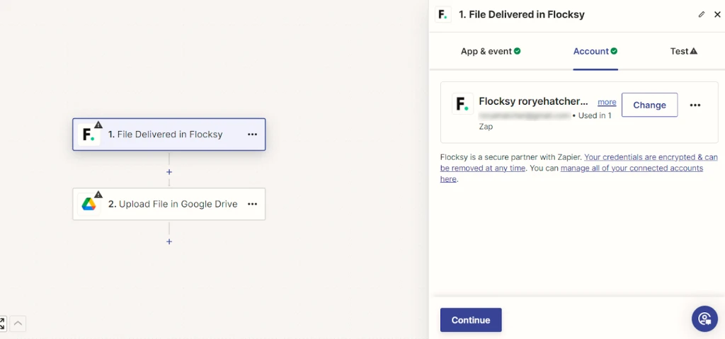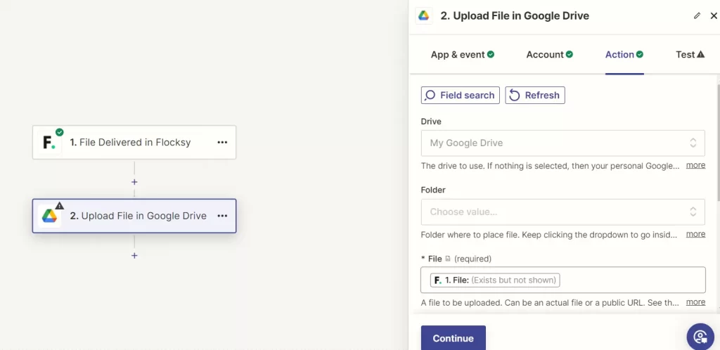 • Click “Continue” to keep setting up your Zap to send your Flocksy project files to Google Drive automatically.