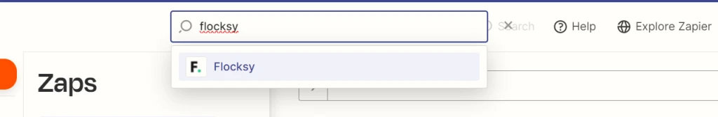 2. Click the “Zaps” option. In the search bar at the top of that page, search for “Flocksy.”