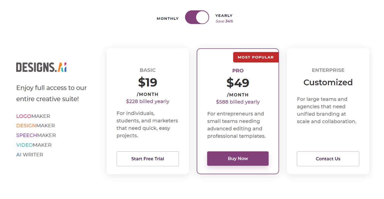Designs.ai offers three pricing packages starting from $29 per month when billed monthly. Users who opt to pay upfront for an annual subscription can save 34% off the monthly subscription rates listed below.