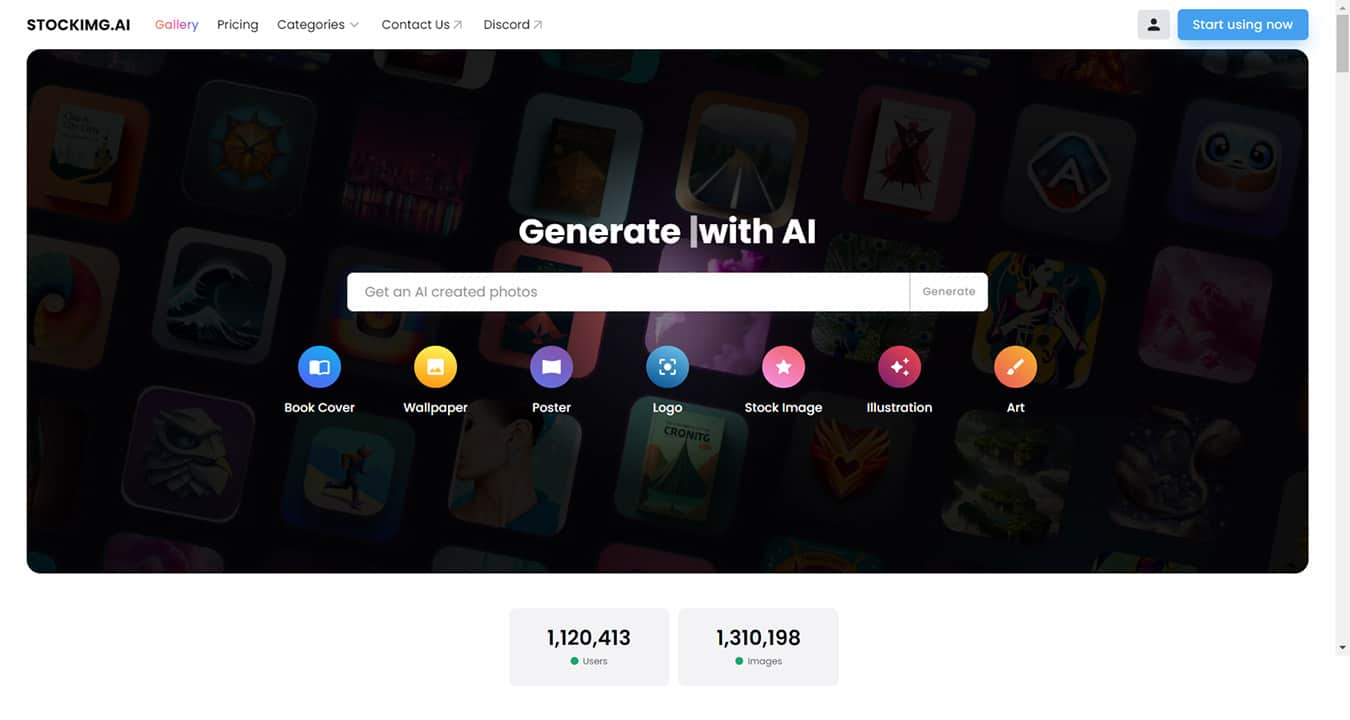 StockimgAI can be used to generate a variety of different projects. The tool features seven basic project categories: stock images, book covers, posters, wallpapers, logos, illustrations, icons, and web/mobile UI.