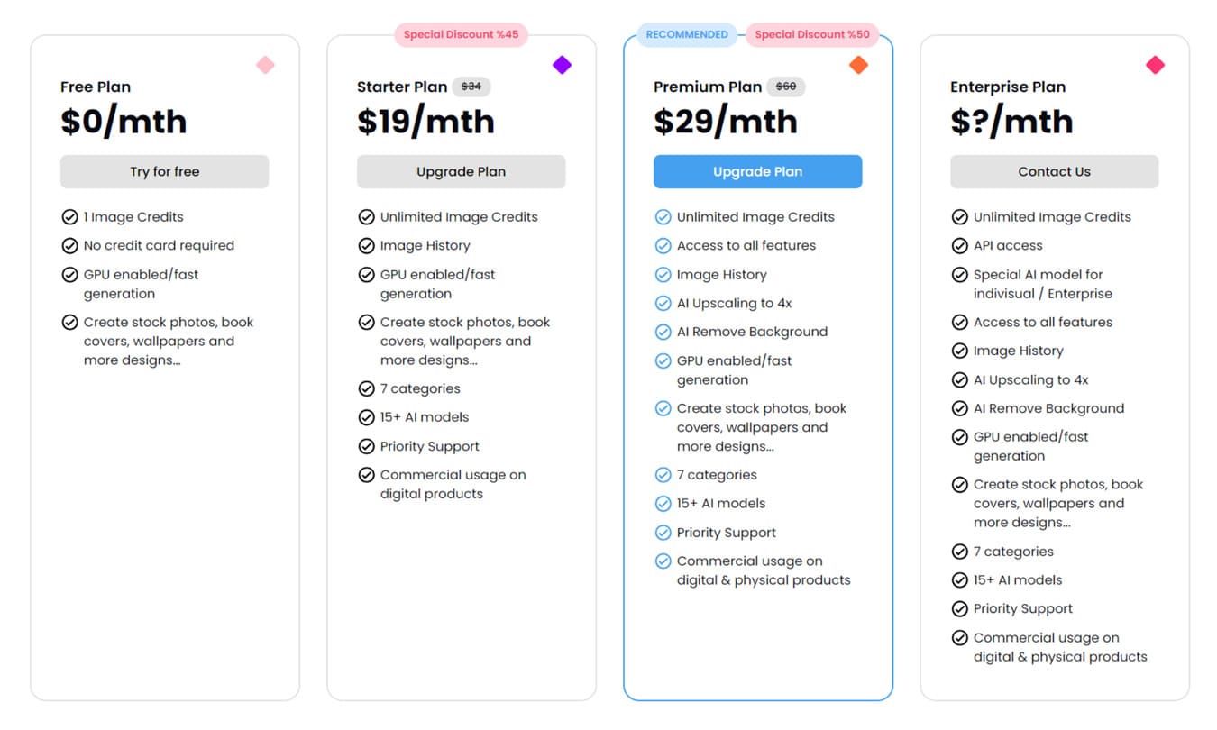 StockimgAI operates on a simple credit-based system. 1 credit = 1 image generation. Users can purchase additional credits through the dashboard or subscribe to one of three subscription packages. The prices listed below reflect the monthly rates at the time of this writing.