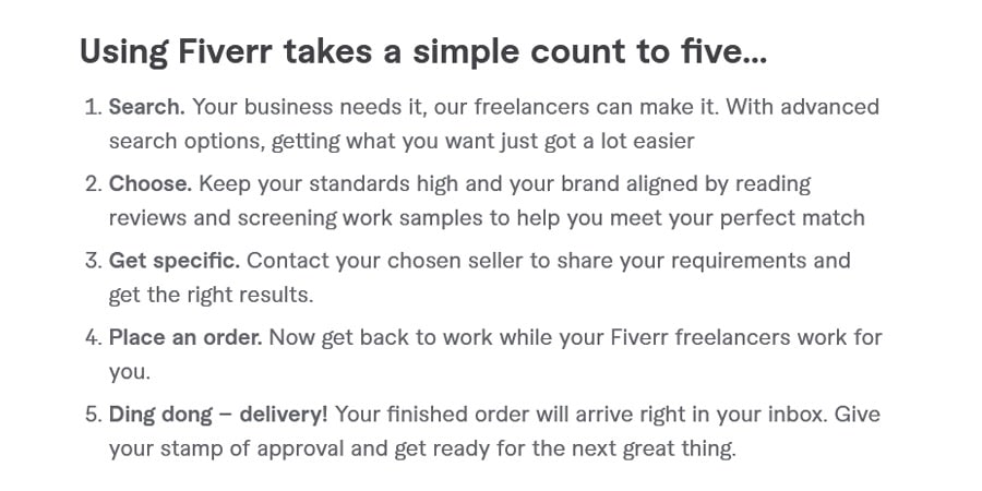 Fiverr is known for its affordable options. This fact alone makes it appealing to many smaller businesses and individuals that can’t afford to work with agencies or hire in-house employees. Purchasing per project and being able to choose only the options you need is a great feature for those on a small budget