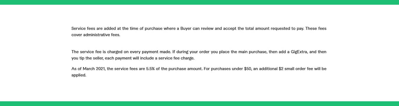 The pricing on each gig varies, of course, but you’ll find the three-tier structure on all of them. Though they do state that you’ll pay a set service fee. “All transactions, including tips, are required to pay the service fee.”