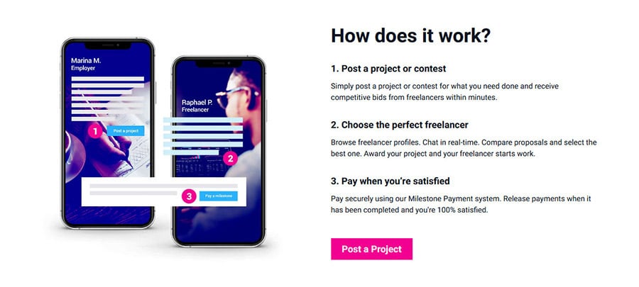 Freelancer is pretty simple to use. First, you’ll post a project or contest. You’ll use their platform to describe what you need done and receive bids from freelancers within minutes. Then, you can choose the right freelancer by browsing their profiles, chatting with them in real time, and comparing proposals. From there, select the best person for the job. Once a freelancer has been awarded your project, they’ll get to work. Lastly, you’ll pay for the job when you’re satisfied using their secure Milestone Payment system. You can release payments when it has been completed and you're happy with the results.