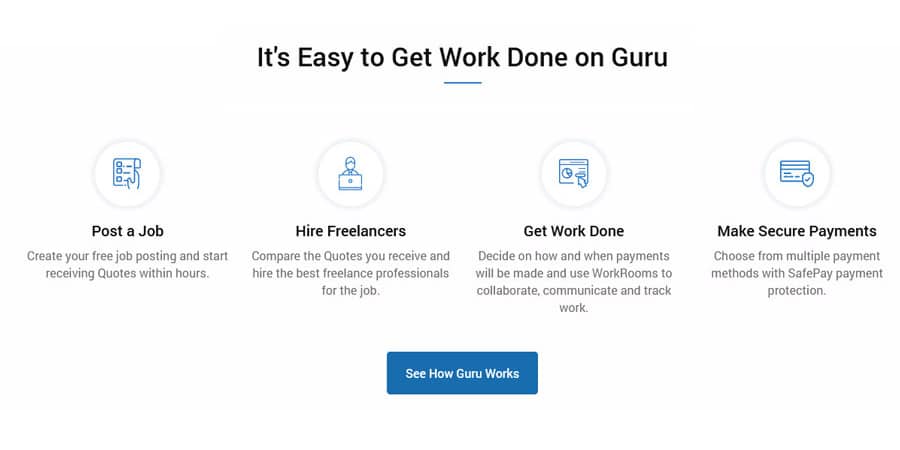 Guru begins with signing up. You can join for free, post your job, and start getting quotes from freelancers quickly. You can verify your details in one step. Then, you can start posting jobs. You can also upgrade your job post to a "Featured Job" to receive 50% more quotes.