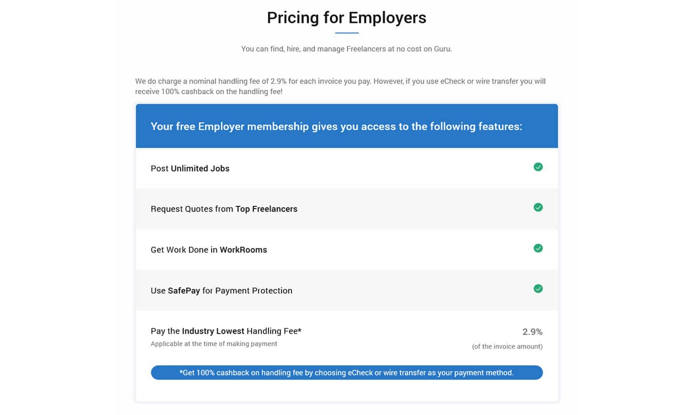 Setting up an employer account on Gurur is free. You can find, hire, and manage freelancers using their online platform at no cost. They charge a handling fee of 2.9% for each invoice paid, which is one of the lowest amongst its competition. Additionally, if you use eCheck or wire transfer, you get 100% cash back on the handling fee.
