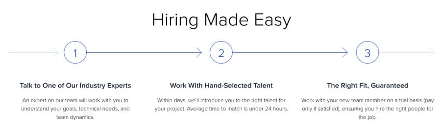 From there, Toptal can provide you with another expert, or you can decide to part ways. They state their goal in this situation is to provide you with someone who may be a better fit. With this new person, you’ll start a second no-risk trial.