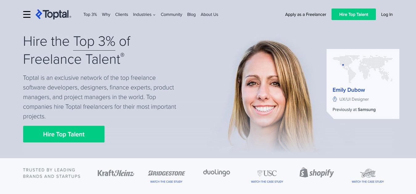Toptal promises freelancers with the highest levels of professionalism and skill. They state that you can hire much faster than doing it on your own, with hires possible in under 48 hours. They allow you to scale up or down whenever you need. They also offer flexible engagements with their freelancers, from hourly to full-time work.