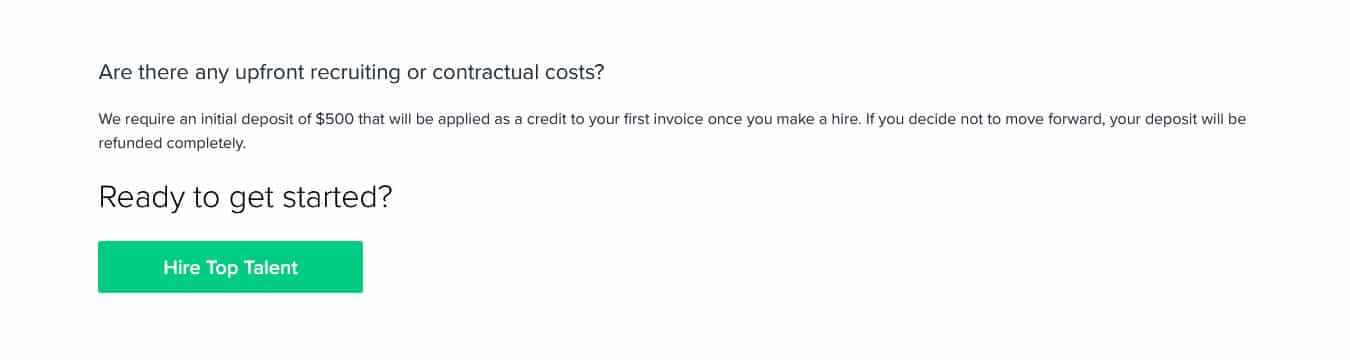 Toptal doesn’t charge a recruitment fee and promises quality results. They pre-screen their talent, and there is no cost to terminate an employee or if you decide to go with someone else. Toptal is a good option when you’re looking to upscale your team quickly.