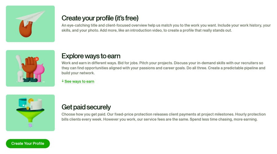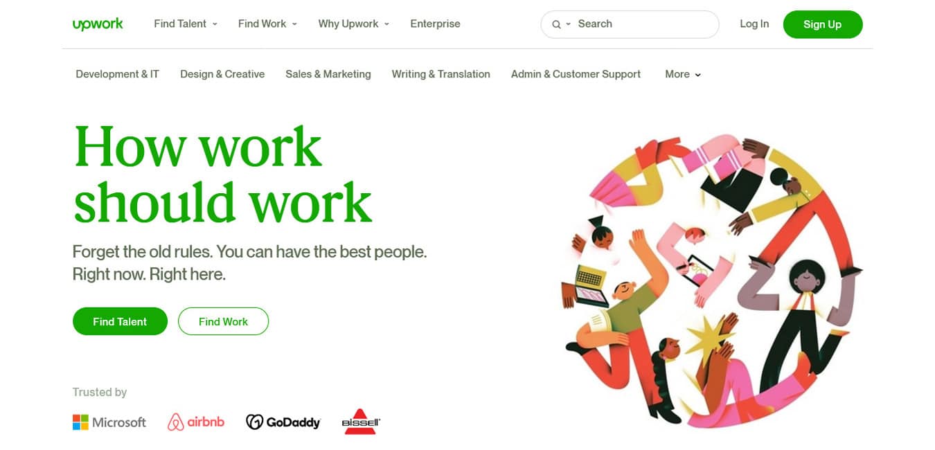 Fiverr promises “A whole world of freelance talent at your fingertips.’ They’re a very large and notoriously inexpensive option when it comes to online freelance marketplaces. They offer various services at nearly every price point that are all structured on project-based pricing. Once you find a freelancer to start your project, they can begin work in minutes. Fiverr also offers a number of project categories, from graphic design to writing to AI services to business to lifestyle. Anyone from around the world can sign up to be a buyer or seller on Fiverr.
