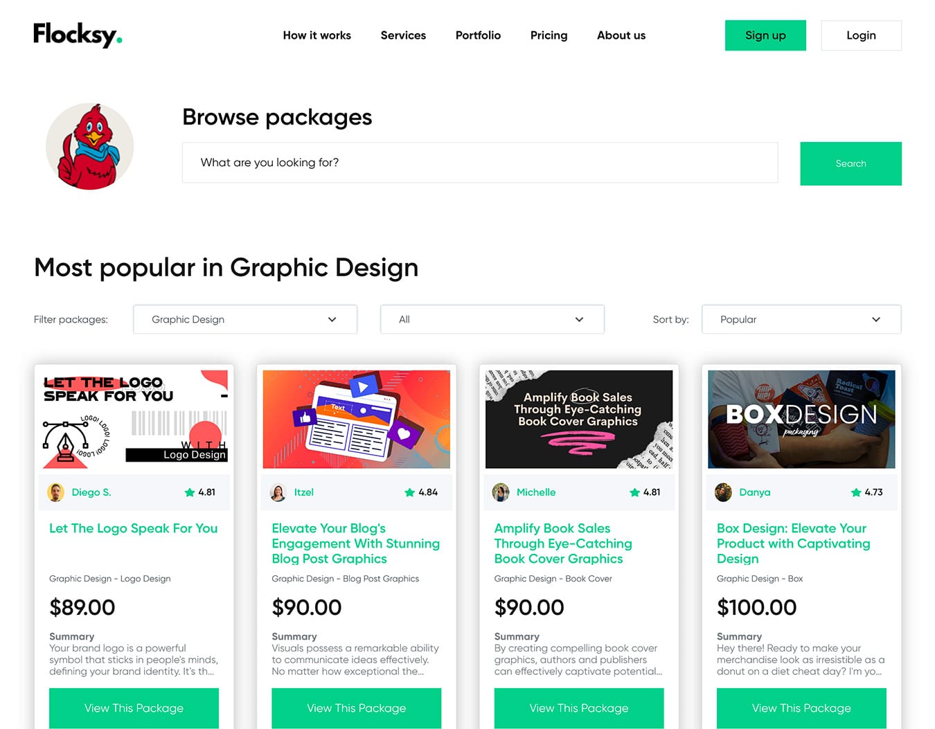 The Flocksy Marketplace is user-friendly and easy to navigate. Individual creatives offer creative services in detailed posts summarizing the project cost, expected turnaround time, revision policies, and more.
